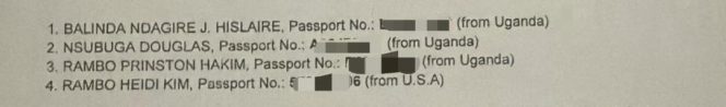 She named three individuals who travelled with her from Uganda to Abuja: Balinda Ndagire J. Hislaire; Nsubuga Douglas; and Rambo Prinston Hakim.