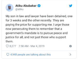 Atiku in a Tweet on his Twitter handle on Monday said : ‘My son in law and lawyer have been detained, one for 3 weeks and the other recently. They are paying the price for supporting me. I urge those now persecuting them to remember that a government’s mandate is to pursue peace and justice for all, and not just those who support them.’