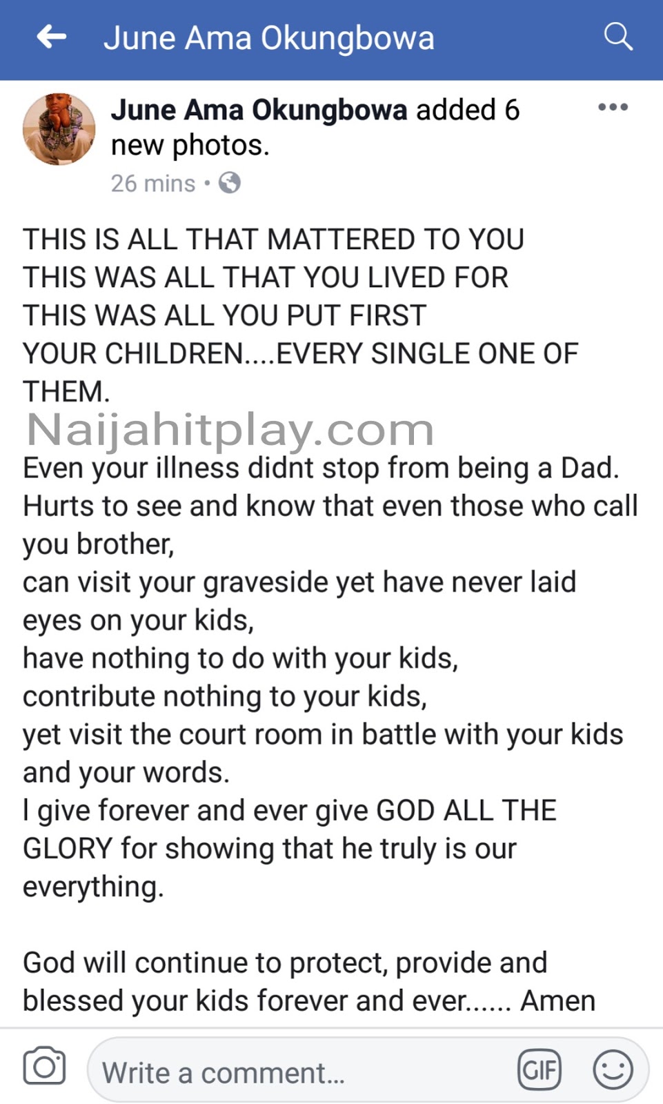 According to what she posted on facebook, Ojb during his lifetime was a very good father and even when he was seriously ill, he still cared immensely about his children, but those who used to call him ‘brother’ when he was alive have not been doing anything for his kids since his death.
