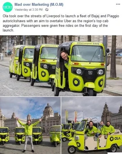 “Ola took over the streets of Liverpool to launch a fleet of Bajaj and Piaggio autorickshaws with an aim to overtake Uber as the region’s top cab aggregator. Passengers were given free rides on the first day of the launch.”.