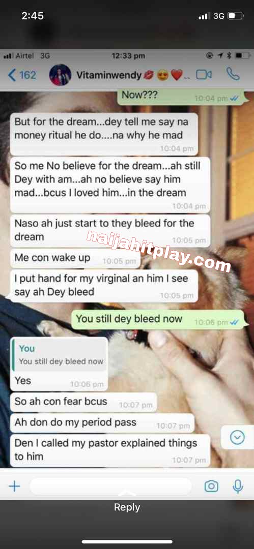 According to the chats she had with her friends, just before her death, she dreamt that she was bleeding, and was told in the dream, that her boyfriend had used her for ritual.